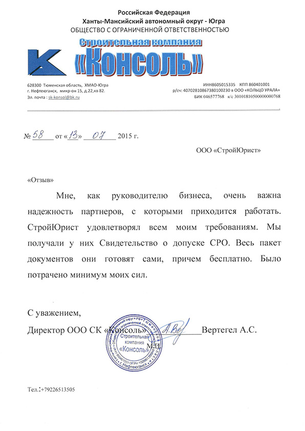 Отзывы клиентов "СтройЮрист" по вступлению в СРО в Омске